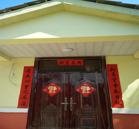 高铁岭镇陆水村易地扶贫搬迁集中安置点,一位60多岁的老兵在新屋门口贴出的迎新对联,题为“新屋堂中春日暖,老兵心里党恩深”,横批:“共产党好”!